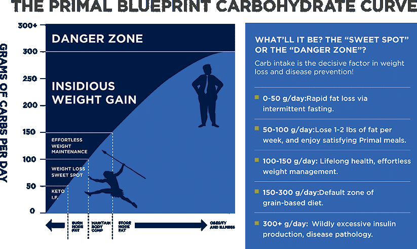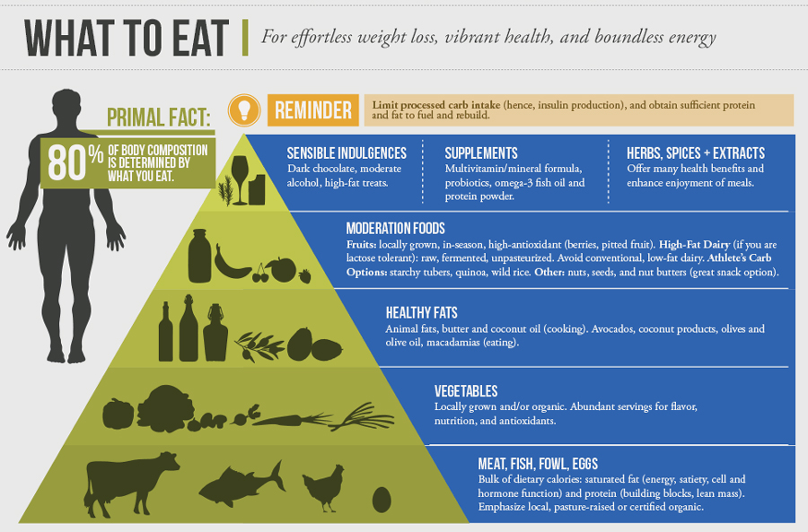 (click on the image for an expanded view) Animal protein plays a big role in the Primal/Paleo/Zone diets, especially for those engaged in concurrent strength-training. Note the focus on pasture-raised, grass-fed, organic, wild-catch and local sources. Similar to humans, the animals we eat are as healthy as their diets. If animals we eat were not nourished well, how can expect their meat to nourish us any better? This focus on meat does not mean that vegetarianism and veganism are to be eschewed. There is much evidence for the benefits of plant-based diets — though those on them do need to pay more attention to ensuring they consume enough protein during the day for healthy body function. How Much Should I Eat to Lose Weight?It’s tempting to view losing weight as simple math: that to lose weight you just need to eat fewer calories than you burn off. While that is not necessarily untrue, it can lead to unhealthy decision-making. It’s important to realize that all calories are not created equal. Intake of “good” calories can actually catalyze weight loss, and conversely, “bad” calories will trigger weight gain. As for bad calories, the big baddy to watch out for is processed carbs (sugars, grains, etc). Anything that spikes insulin production. The Primal Blueprint program encourages us to consume less than 150 grams of *any* kind of carbs per day: