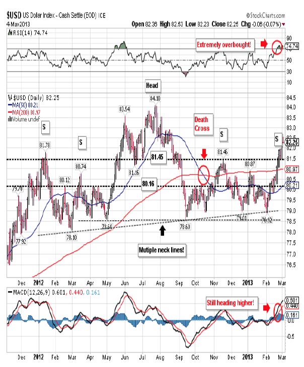 So the Fed is barely keeping even with servicing the tip of the iceberg. In fact I have been telling investors for five years that the Fed has committed a serious if not fatal error by reacting after the fact instead of acting before the problem blows up in your face. Once again I want to remind you that we are just talking about the tip, and the real problems lay well below the surface. Below the tip we have a mountain of debt euphemistically referred to as "unfunded obligations." These are things like all the money owed to the Social Security Trust Fund, Medicare, Medicaid, and so on… Depending on whom you listen to this amounts to a minimum of US $80 trillion and could even exceed US $150 trillion. Although this sounds like a lot of money, this only comprises about 20% of the iceberg. The Fed's panacea of quantitative easing is not directed toward these unfunded obligations because they are under the surface and out of everybody's radar. The Fed's only course of action so far has been to tell Congress to deal with it. Congress does what it does best and that is nothing. To make matters worse the unfunded obligations are growing at no less than 5% a year, or a minimum of US $4 trillion. So between national debt and unfunded obligations, total debt is increasing by no less than five trillion dollars and comprises no more than 25% of our iceberg. Now you can see that the Fed's contribution of US $85 billion pales in comparison to what is needed, and you can begin to understand why the velocity of money is sloped downward like a rabbit headed down a deep hole. Still we are only dealing with 25% of the iceberg. The real meat of the issue deals with something called over-the-counter derivatives. According to the Bank of International Settlements the amount of OTC derivatives totaled US $640 trillion as of June 2012. I have seen other estimates that that almost double this amount, but even using lower figures it comprises 75% of our iceberg. Most of these are interest sensitive and are almost always denominated in US dollars. With the increase in interest rates over the last nine months you can rest assured that some stress exists. Because they are OTC they are unregulated and there is no way to know if either party actually has the money to back up its obligation. Since the world economy is valued at US $80 trillion, it's a safe bet that they don't. Finally, assuming a 1% growth rate that tacks on another US $7.5 trillion a year in new debt. So now you can begin to grasp the problem in its entirety. The Fed is merely trying to keep the cork in the bottle and it's losing the battle to the tune of US $11.5 trillion a year versus the US $1 trillion flowing out from its printing press. As I see it the debt will begin to increase exponentially within a year or so. Additionally, a side affect of so few dollars chasing so much debt is upward pressure on the US dollar and through what was strong resistance at 81.45 as you can see here: This upward pressure is going to continue over the short run and I would not be surprised to see the dollar reach resistance at 84.89 before finally turning down. In fact if you think about it long enough you can also understand why interest rates have been on the rise as shown in this chart: