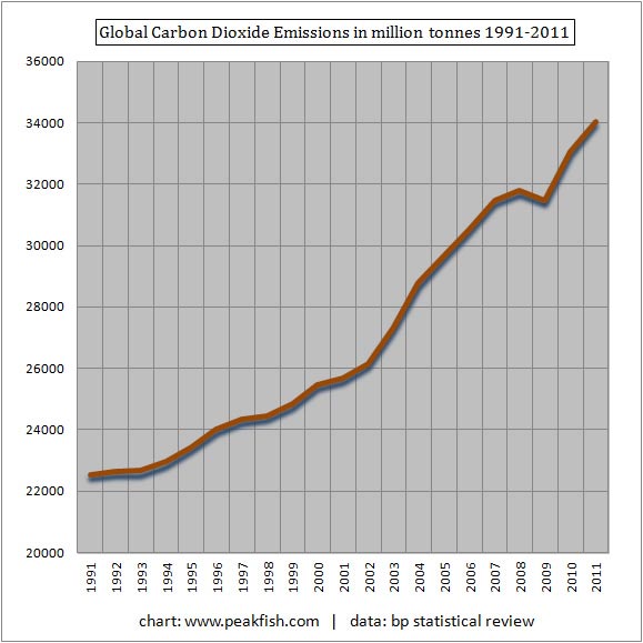Thankfully, Japan's latest attempt to recover by aggressive devaluation is almost assured to provide resolution to its generational quagmire. But the outcome will not look anything like recovery. Instead, Japan has entered the terminal phase of its long, reflationary road. Culturally, the frustration and exhaustion at the country's lack of progress has unsurprisingly led to this important juncture. The Japan recoverists are correct that the latest round of monetary policy "is not like the others." However, the results are likely to provide a real-world test case of the limits of Keynesian policy at a time when the world faces scarce resources. This final chapter will be spectacular. So in a lurid sort of way, we should be thankful that Japan has now crossed the threshold and is ready to proceed to its denouement. The Miracle of Post-War Japan & Resource ArbitrageStudents of ecological economics should pay close attention. Japan is about to add itself as a test case. Ecological Economics is a thesis of elegant simplicity. Simply put, the economy is a subset of the environment – and not, as neoliberal economists would have you believe, the other way around. Economies can “grow” up to the limit of the natural resources which they can extract, or acquire. In a time of cheap resources, when the cost of inputs is extremely low, the importance of these inputs tends to be ignored. Thus, we can see the most obvious implication of environmental economics is that extraordinary profits can be harvested when the price of resource inputs is low and the purchasing power of consumers in the market place is high. This is exactly the condition that allowed post-war economies like Japan to reap gigantic capital windfalls during their post-war industrial phase. Additionally, it is also critical to point out that the prices of energy inputs in the post-war era were so cheap that it was not necessary for countries like Japan to own any such resources domestically. Indeed, as it's well known, Japan is nearly barren of any large deposits of energy resources. Countries like Sweden, South Korea, and Japan during the 1945-2000 period essentially engaged in a kind of resource arbitrage: sourcing energy inputs from abroad and using them to manufacture high quality goods for export. If the resource-curse explains how countries rich in oil, copper, iron ore, and coal often wind up in a place of stagnation and corruption, bereft of innovation and diversity in their economies, then a country like post-war Japan received a kind of resource-poor blessing. Short of raw materials, Japan's only choice was to become expert in using raw materials to get rich. And rich, indeed, did Japan become. But all things must pass. The greatest gains from Japan's industrial arbitrage were harvested from after the war up to 1990. It would be impossible to exaggerate how much capital the country extracted from the world economy during this time. It would also have been impossible, given the tidal wave of that capital, for Japan to have avoided the asset bubble, whose bursting, just a decade before the new millennium, would prove so crippling. By the time Japan had hobbled into the year 2000, new low-cost manufacturers like Mexico, China, and other Asian countries had appeared on the scene to essentially imitate Japan's post-war triumph. Japan & Ecological EconomicsEconomies consume natural resource inputs, produce useful services for people, and generate waste. Fed a steady diet of affordable energy, the global economy grew and produced waste for most of the post-war period. Until, of course, the energy shock of high oil prices and the bursting of the credit bubble halted growth, in 2008-2009. The results were unsurprising, and best articulated by the global output of CO2 emissions in the chart below: