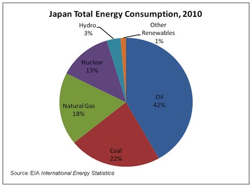 Global carbon dioxide emissions fell as expected during the crisis of 2008-2009, as global industrial output crashed. Since that time, the world has built GDP on the back of electricity supply – not oil supply – as the transition to natural gas and coal continued and moderate growth resumed. Japan fits into this picture in a very intriguing way, because of its new call on coal and natural gas in the wake of the Tohoku Earthquake. But here Japan has run into serious problems. Problems which will not ameliorate, but instead will worsen. Following the Abundance ScriptAfter WWII, Japan followed precisely the kind of thesis laid out in Peter Diamandis' book Abundance. In the view of Diamandis, history shows that humans are so amazingly innovative and productive that scarcity of natural resources is no barrier to successful economies. Diamandis argues that history shows that over time many natural resources are substitutable, or expandable in their supply. And that human-created technologies trigger revolutions in resource allocation and availability. Many of the enormous gains that Diamandis forecasts for the world in the next 20 years were captured by Japan after the war, as it ingeniously imported metals, rubber, silicon, oil, and other resources to make cars, electronics, and other highly engineered equipment. Indeed, Japan no doubt gave the world a number of energy-saving devices as its own economy became a hyper-efficient user of energy in its own right. Japan consumed its own products, as well, and became one of the lowest per capita users of energy while maintaining one of the most powerful industrial complexes in the world. The fifty years between the war and the new millennium was a time of price stability in global energy prices. Oil averaged, on an adjusted basis, at roughly $15 per barrel. Coal, increasingly rejected by industrial economies, was also cheap. And no other industrial economy took better advantage of these fertile conditions than Japan. Using a population not much bigger than Britain, Japan bulked up to become the third largest economy in the world with extraordinary industrial output. Those TVs, stereos, and of course automobiles, were manufactured using cheap imported coal, and oil. It is not a coincidence that Japan also seized the nuclear opportunity, starting in the early 1960's. Yes, coal was still cheap, but Japan's economic security demanded that a country naked of domestic energy resources look to securing its future. And that is how Japan seized both the miracle and the nightmare of nuclear power. The Tohoku SurpriseJapan's hyper-efficient, energy-conserving economy was not completely shielded from the new millenium’s price revolution in oil. That said, Japan has done an extremely good job of bringing oil down to 40% of its total energy consumption mix. Japan can be still be thought of as a substantial user of oil, but, an even heavier user of electricity sourced from imported LNG, imported coal, and its own nuclear power. | see: Japan Total Energy Consumption 2010, source EIA Washington: