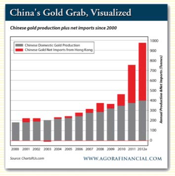 Some years ago the Wendy’s hamburger chain ran what was probably its most successful advertising campaign ever where the punchline – ‘Where’s the beef’ - was uttered by a little old lady. How much more so might this be relevant to the gold and silver markets today where the volumes traded on the key markets exceed the amount of physical metal available many, many times over. As numerous observers have pointed out this opens them up to accusations of severe market manipulation and seems to be something the various financial authorities seem unable, or unwilling to take a serious interest in curtailing. But if this is the case, what is happening to the newly mined physical gold and silver? Where’s the gold? India and China on their own account would nowadays seem to take the bulk of global production based purely on Indian government statistics and Chinese official data for imports through Hong Kong, coupled with China’s own gold production which doesn’t leave the country. Add to that smuggled gold (into India in particular) and gold possibly entering China through other channels plus announced Central Bank purchases and one wonders indeed how physical demand elsewhere in the world is being satisfied – and there is indeed demand for physical bullion other than in those two nations and from the Central Banks. Gold and silver bullion coins are selling at record levels and this may even be dwarfed by sales in small bar form. The real statistics just don’t seem to add up. Some of the demand may have been satisfied in recent weeks by offloads from the SPDR Gold ETF in particular, although there are some, like Eric Sprott, who cast doubt on the ETFs holding what they say they do in terms of physical metal. If this is the case it would suggest a fraud on a massive scale and this writer tends to discount this suggestion, at least as far as the biggest players in this sector are concerned. Sprott also feels that perhaps Western Central Banks are supplying the markets with physical gold without reporting it– indeed many have suggested that the central banks do not hold what they say they do, having leased it out to the bullion banks who have, in turn, sold it on. The Central Bank accounts show leased gold as still being on their books, but with a potential shortage of physical metal on the markets, so the theory goes, it would be difficult to claw the metal back into the Central Bank vaults in a short period of time – if ever! This accounts for the theories which have sprung up over the German Bundesbank having to wait seven years to repatriate some of its gold from the NY Fed – a process which should be able to be achieved in a matter of days, although admittedly banks do not tend to move quickly at the best of times – but perhaps not that slowly either. If this does, indeed, represent a globally orchestrated attempt to supress theprice of gold, as commentators like the Gold Anti Trust Action Committee (GATA) have alluded to for many years, it is not one aimed at preventing the gold investor making money – that is collateral damage – but rather it would be an attempt to maintain some kind of global financial stability, given gold’s centuries-long role as a bellwether of financial responsibility. The profligate printing of money under the Quantitative Easing programmes makes this very relevant today and is perhaps why the assumed market manipulation seems to be so open and intense. To an extent whether or not this manipulation is present, is of lesser importance than the shift in economic power from West to East – or at least from the developed world to the developing nations currently underway. It is the BRICS, and other developing nations, which are building up their official gold reserves to give them a stronger foothold as the global world order is seen to be changing. Indeed it is China among these which many assume is increasing its gold reserves fastest, but without officially announcing this lest such news causes the gold price to soar, thus making it more costly to continue its surreptitious gold purchase programme . But China is also probably unwilling to see the gold price fall back much either as part of its policy has also been to encourage precious metals investment by its people – and maintaining, and increasing, its peoples’ wealth is an important factor in retaining control over its massive population. To come back to the beginning of this article and its title – Wheres’ the gold – or the silver? – much of the newly mined gold does indeed seem to be being moving into China in particular. It is worth demonstrating this graphically with a chart recently published by Agora Financial which shows the huge, and growing, rise in gold’s holdings in China taking into account its reported imports and its growing domestic production. One might well ask why China is building its gold holdings to such an extent. The Chinese, with their more tightly controlled society, think long term to a far greater extent than the Western Capitalist system would seem to allow where short termism is the principal way markets play out. The Chinese are looking for the yuan to replace the dollar as the world’s global reserve currency with all the economic advantages that brings. As the dollar replaced the pound sterling in this role during the last century so, the way things appear to be going, the yuan will replace the dollar in the current one. With China’s economy – even at its current relatively depressed level – growing hugely faster than that of the U.S. it will only be a few years before it overtakes the U.S. economy in size and will come to dominate global trade in the way the U.S. has for most of the last century. The world order is changing, and gold is a significant factor in the equation – at least that seems to be the way the Chinese see it. So what next for gold and silver? The gold bulls predict a serious supply squeeze developing for physi
