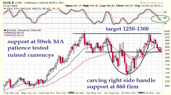 Gold Reflects U.S. Dollar Instability The gold cartel is gradually losing control. They can put out a ‘double down’ futures contract short attack. They can reduce gold lease rates to below zero. They can avert a COMEX default at the eleventh hour. The consolidation process continues with a carving of the right side handle to the Cup & Handle reversal pattern in the gold price chart, as patience is surely tested. Support has been good at the more stable 50-week moving average, aided by the May 2008 support, both at the 860-865 level. Today on Thursday, the gold price finally jumped over the 900 mark, and even silver enjoyed a big rise of 3%. Currencies are being ruined universally, as governments debauch their supply fundamentals with what they regard as impunity and zero cost, very mistakenly. The costs come later, from price inflation, lost stability in the monetary foundation itself, and new unforeseen bubbles. The gold price target remains 1250 to 1300 once the 1000 mark is cleared. Watch for the potential of a bullish stochastix crossover in the green oval in the next week, an event that technicians would notice. It would signal a substantial move up soon.