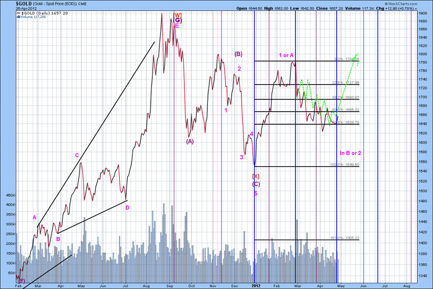 This article was presented to the benefit of subscribers of TreasureChests.info on Wednesday April 25th. Commentary is presented initially, followed by technical analysis of 3 currencies and the US Dollar Index and Gold, ultimately showing that a high probability is forming for a break to the upside in gold, primarily triggered by a large looming decline in the US Dollar Index. Over the past weekend, China announced that they would purchase Iranian oil through sale of gold beyond June 28 2012 in order to get around US sanctions that states no nation can sell oil in US Dollars This has profound implications going forward, as this will be the first time in nearly 70 years that the US Dollar as a reserve currency has been challenged. The article I penned back in 2003 titled "Whose Gonna Say Uncle" mentioned that block currencies will likely form due to localization of economies due to energy constrictions etc. The BRICS nations have primarily been the target of sabre rattling through the US government, so actions taken by China is likely to be conducted on a massive scale going forward as other nations seek better control over their own destiny. The BRICS nations are a force to be reckoned, with, from a financial and military perspective. Sabre rattling coming out of Washington is merely that...there is not much that they can do to save the US Dollar, as other nation blocks slowly attempt to create localized currencies. All major wars being fought at present are economically related as each country tries to stay afloat in an environment where an ever increasing amount of debt is created daily to prevent deflation (Note: This can only be put off for so long as the CFS cycle reaches its next downward turning point). As bickering and economic warfare continue up front along with the Bread and Circuses put on national TV to dumb down the masses, the page 16 story (As Donald Coxe refers to stories out of the eyes of the majority) unfolding is that gold is slowly being set up to be a major currency of exchange. Banks around the globe are quietly accumulating metal in order to preserve wealth for what lies ahead beyond 2020. Between now and 2020, gold is likely going to see a spike high between $7000-10,000/ounce (maybe higher) and then drop by 50% and baseline. Subsequently, a broad stock market rally beyond 2020 will be likely likely after ending a near 20 year bear market. During this time, governments will still have to inflate, but this will be the start of an inflationary cycle, which should see the DOW reach 200,000ish at some point this century, as per Glenn Neely's long-term forecast. As assets rise in price, it will still be important to have gold-backed currencies, as people 8 years out will not want a repeat of 2000-2020. Back here in good ol' 2012, we still have 8 years of tough sledding before we get through this mess and the only thing I have seen to somewhat guide with reasonable accuracy for turning points is the Contracting Fibonacci Spiral first observed last July. The target date for the broad markets putting in a high is between September 12, 2012 and March 6th, 2013, with December 6th 2012 as the ideal mid point. During other cycles, the S&P has remained buoyant after putting in a high while other sectors of the economy rally. The CFS date for gold I believe is September 13th, 2013, which could occur as early as May 2013. Given the expected decline in the US Dollar Index starting anytime between mid May to early June, this suggests that a 10-12 month rally in precious metal stocks and commodities is likely. At present, there is no shortage of liquidity and we are nearing the stage where funds are rotating into under performing sectors. Within the CFS, declines are noted by sharp periods of deflation, such as that witnessed in 2008. The next round of deflation is starting to appear as is if it will occur between May 2013 and August 2013 and last until late 2014. As we reach the point of singularity in 2020, market volatility is going to be at levels never seen before. The one sector witnessing a large counter trend relative to the broad stock market indices is the precious metal arena AKA the AMEX Gold BUGS Index. This has been the one sticking point with the CFS which is seeing gold stocks marching to the beat of its own drummer at present. As mentioned current lows in the HUI will represent a generational low relative to the price of gold. On Friday, the HUI/Gold ratio gapped down to 0.26 and has two daily hammer doji's in place. It is important to note that the 2008 lows saw a spike low value of 0.20, which was a spike low. Values quickly bounced up to 0.25 and trended to near 0.45 before declining. At present, we have gold above $1600/ounce, while gold stocks are priced as if gold was $700/ounce. With gold set to move higher with continued money printing campaigns, it only makes sense that gold stocks rise accordingly. By Christmas time, everyone in PM's should have something to smile about, with the top expected sometime between April and June 2013 in the HUI. The above information is how things are thought should logically progress before we hit the next wave of deflation (It will be far more severe than 2008). As mentioned before, avoid adding further positions to PM stocks until we have a clear indication that a bottom has been put in place. Accompanying this text are related charts of 3 currencies, the US Dollar Index and one chart of Gold illustrating that a breakout to the upside is looming. CurrenciesThe daily chart of the Canadian Dollar Index is shown below, with a closing value of $101.31, just at the upper point of resistance. All three lower Bollinger bands are in close proximity to each other, and if they begin to curl down, it will indicate the Loonie is set to climb higher. An inverse head and shoulders pattern appears to have been put in place, which has a measured move of 12 cents, or $1.13 relative to the US Dollar Index. Our target for the Loonie in 201