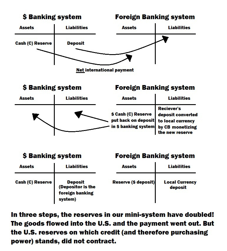 ![]() Notice that I am avoiding the use of gold in my illustration. The warnings given in 1931 and 1960 were presented in the context of a gold exchange standard of one form or another, and therefore they (of course!) heavily reference the problems as they related to ongoing gold redemption. But the real problem, as I have said, transcends the specific issues with gold at that time. The real problem was and is the common thread I mentioned earilier: the monetary privilege that comes from the rest of the world voluntarily using that which comes only from your printing press as its monetary reserves. It was and is, as Jacques Rueff put it, "the outcome of an unbelievable collective mistake which, when people become aware of it, will be viewed by history as an object of astonishment and scandal." Another angle which was apparent from the very beginning—because Rueff mentioned it in 1932 (as quoted above)—was that of international lending. It basically worked in the same way as the three steps above except that the net international (trade) payment was an international loan. Remember that the U.S. was the prime creditor to the world following both wars. This may partly explain the inflow of gold payments that brought the U.S. stockpile up from 3,679 tonnes in 1920 to 20,663 tonnes in 1952. A dollar loan was the same as a gold loan and was payable in dollars or gold. But as Rueff pointed out above, the lent dollars came immediately back to New York just as the pounds came back to London: "During the entire postwar period, Britain was able to loan to Central European countries funds that kept flowing back to Britain, since the moment they had entered the economy of the borrowing countries, they were deposited again in London. Thus, like soldiers marching across the stage in a musical comedy, they could reemerge indefinitely and enable their owners to continue making loans abroad."Now think about that for a moment. The same reserves (base money) getting lent out over and over again like a revolving door. And let's jump forward to the present for a moment to see if we can start connecting some dots between 1932 and 2012. Here's a recent comment I wrote about the revolving door of dollars today: Hello Victor,I highlighted the part relevant to our revolving door discussion, but the whole comment is relevant to the whole of this post because I had this post in mind when I wrote the comment. Anyway, can you see any similarity between what Jacques Rueff wrote about the sterling in 1932 and what I wrote last week? How about a difference? That's right, the U.S. is now the world's premier debtor while it was the world's creditor back in the 30s. But in both cases the dollar currency is being continuously recycled while notations recording its passage pile up as reserves on which foreign bank money is expanded while the U.S. counterpart of reserves and bank money is not reduced as a consequence of the transfer. If you print the currency that the rest of the world uses as a reserve behind its currency, that alone enables you to run a trade deficit without ever reducing your ability to run a future trade deficit. Deficit without tears it was called. For the rest of the world, running a trade deficit has the finite limitation of the amount of reserves stored previously and/or the amount of international liquidity (reserves) your trading partner is willing to lend you. Another thing that happens is that, as the printer of the reserve, the rest of the world actually requires you to run a balance of payments deficit or else its (the rest of the world's) reserves will have to shrink, and its currency, credit and economy consequently contract. So to avoid monetary and economic contraction, the world not only puts up with, but supports your deficit without tears. Here's a little more from Jacques Rueff: