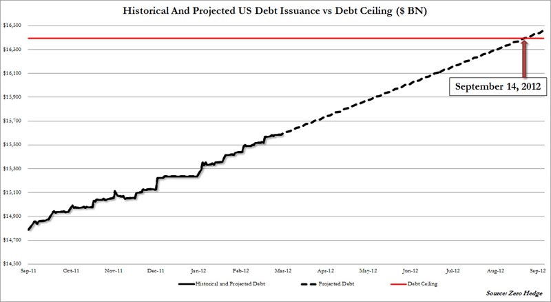 President Barak Obama gave a speech to newspaper executives about the recently passed Republican budget in the House of Representatives. It proposes to cut spending by more than $5 trillion over the next ten years. Yesterday’s speech was, basically, a declaration of war against the GOP and its vision of the government’s budget. The President said, “This Congressional Republican budget is something different altogether. It is a Trojan horse disguised as deficit reduction plans. It is really an attempt to impose a radical vision on our country. It is thinly veiled social Darwinism. It is antithetical to our entire history as a land of opportunity and upward mobility for everybody who is willing to work for it. A place where prosperity doesn’t trickle down from the top but grows outward from the heart of middle class.” (Click here for the full transcript of President Obama’s speech.) It didn’t take long for the Republicans to fire back. The AP reports, “House Speaker John Boehner said Obama is resorting to ‘distortions and partisan potshots’ — while standing behind policies that the speaker says ‘have made our country’s debt crisis worse.’ And a Mitt Romney spokeswoman says Obama’s in no position to lecture about ‘responsible federal spending.” (Click here for more from the AP.) Folks, it is officially “game on,” and every American should be scared speechless about this budget showdown. It is unlike any the nation has ever faced. The country has never been more in debt, and this comes at a time when countries like China are shunning U.S. Treasuries. There are more than 12 million “officially unemployed.” (The unofficial is 22 million.) Home prices are falling despite near record low mortgage rates. The BRICS nations are actively seeking an alternative to the U.S dollar for settlement of trade, which could threaten the dollar’s reserve currency status. We are threatening financial war with any country that trades with Iran, and the nation is facing yet another shooting war in the Middle East. The only question is will it come before or after the election. Last August, Congress raised the debt ceiling by $2.1trillion in exchange for at least $2.1 trillion in budget cuts over the next 10 years. A so-called “Super Committee” of Democrats and Republicans was supposed to agree on a deficit reduction plan, but they couldn’t agree on a single dime of spending cuts or tax increases. That’s right, the deficit was not cut, but the nation went in the hole by another $2.1 trillion. Currently, the deficit is more than $15.6 trillion, and the debt ceiling stands at nearly $16.4 trillion. (Click here to see the U.S. debt clock.) Some predict the U.S. will hit the debt ceiling or, better put, run out of money by September 2012— two months before the November election. Zerohedge.com charted the trajectory of the nation’s debt a few weeks ago.