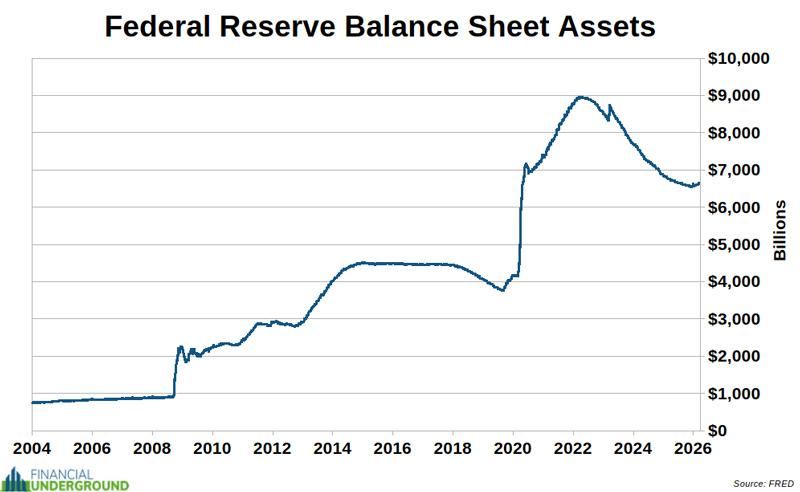 Indicator #5: The Fed’s Balance SheetThe Fed recently announced that it has ended the shrinking of its balance sheet and will now begin expanding it again. The Fed insists this isn’t quantitative easing, calling it “reserve management” and pointing out that it isn’t explicitly targeting long-term Treasuries. That’s just wordplay. Buying Treasuries with newly created money is money printing, regardless of what label they attach to it. The Fed’s balance sheet is expanding again. A new printing cycle has begun. We’ve seen this pattern repeatedly. The Fed expands its balance sheet, then tries to shrink it. Something eventually breaks in the financial system, and the Fed pivots right back to easing and money creation. Each time this happens, the balance sheet never returns to its prior level. It ratchets permanently higher with every cycle of debasement. What makes the current situation especially telling is that the Fed is entering another balance-sheet expansion phase even though the balance sheet is still more than 50% larger than it was before the Covid mass psychosis. Before 2020, the Fed’s balance sheet was roughly $4 trillion. It exploded to nearly $9 trillion during the Covid response. Even after so-called “quantitative tightening,” it remains nowhere near its pre-Covid level. This completely contradicts the Fed’s long-standing claim that programs like QE are temporary. Remember when former Fed Chair Ben Bernanke promised the balance sheet would eventually normalize after the 2008 financial crisis? That promise was made nearly 15 years ago, when the Fed’s balance sheet was around $2.5 trillion and was supposed to shrink back toward pre-crisis levels below $1 trillion. Instead, today the balance sheet is more than double what it was when Bernanke made that pledge — and now the Fed is entering yet another expansion cycle that threatens to push it even higher. The long-term trend is obvious. The balance sheet only goes one direction: up. And the implication is unavoidable. Every time the Fed expands its balance sheet, it debases the currency. This isn’t an accident or a temporary policy error — it’s the core feature of the system. If you’re wondering what comes next, look at the chart below—and note what followed the last time the Fed shifted from shrinking its balance sheet to expanding it. We are now in the top of the first inning of what may become the most aggressive balance sheet expansion cycle in the Fed’s history.