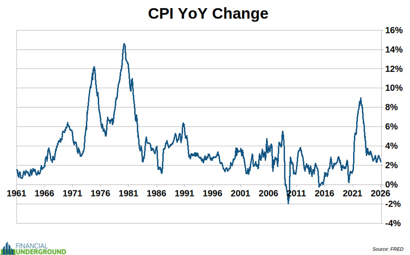 The long-term average YoY change in the money supply is 6.8% per year. Indicator #7: Consumer Price Index The Consumer Price Index (CPI) is the most politically manipulated statistic in all of government. That is saying something because many government statistics are completely manipulated, but inflation, as measured by the CPI, is probably the most manipulated. The CPI is a basket of prices trying to measure the average price changes for 340 million Americans. It’s an impossible task because every individual has a different price basket. Consider someone who lives in New York City compared to someone who lives in rural Montana. They have totally different price baskets. Using the CPI as a measure of price increases for 340 million people is even more preposterous than taking the average temperature across 50 states in the US as a meaningful statistic to determine what clothes you should wear today. Further, the government gets to cherry-pick what items go in the CPI basket and their weightings. It’s like letting a student grade his own paper. In short, the CPI is misleading government propaganda intended to conceal the government’s atrocious currency debasement. All that being said, it is useful to monitor the CPI, not as a meaningful metric to gauge inflation, but as a metric to analyze the Fed’s actions and gaslighting.