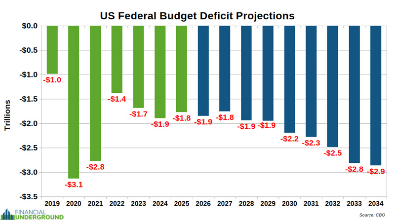 Indicator #1: Federal Budget DeficitsIt’s important to note that these projections rest on the ridiculous assumption that there will be no wars, recessions, or other events that drive additional federal spending. That assumption is already out the window with the Iran war: the Pentagon has requested an additional $200 billion, for starters. The chart below shows the actual and projected federal budget deficits.