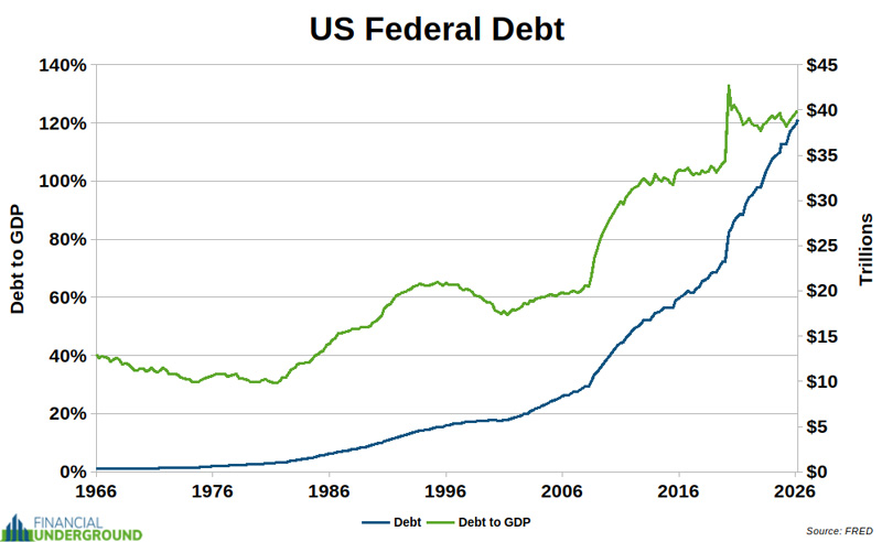 Even with this rosy and unrealistic forecast, the US government is projected to run a cumulative deficit of over $22 trillion over the next ten years—deficits that will have to be financed by issuing more debt, a significant share of which will likely be bought by the Federal Reserve with “money” it creates out of thin air. Indicator #2: The Federal Debt The federal debt has exceeded $39 trillion, representing more than 124% of GDP.
