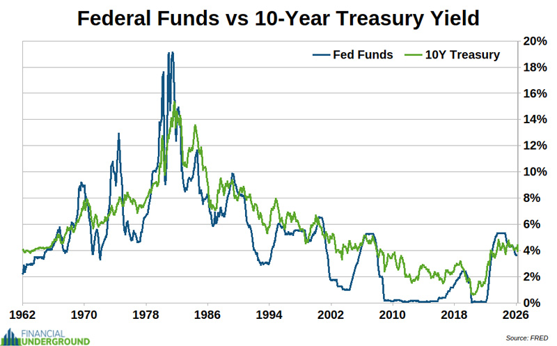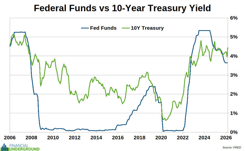The interest cost on the federal debt is already the US government’s second-largest outlay. It’s set to exceed Social Security and become the biggest federal expenditure in a matter of months. Indicator #4: The Federal Funds Rate and the 10-Year Treasury YieldWhenever discussing the Fed or central banks, it’s essential to keep the basics in mind. You have to start with the most fundamental concept: central planning doesn’t work. That’s the first principle. Central planning of shoes doesn’t work. Central planning of wheat doesn’t work. And central planning of (fake) money doesn’t work. Central banks in general—and the Fed in particular—are on a mission impossible. They don’t know what the interest rate should be. Nobody does. That’s something only a voluntary market of savers and borrowers, dealing in honest money, can determine. A politburo can’t centrally plan interest rates any more than it can potatoes. They are inevitably going to fail—and cause significant damage in the process. It’s also crucial to remember that central banks have nothing to do with the free market. They are, in fact, the antithesis of it. In Karl Marx’s Communist Manifesto, central banking is the fifth plank. With that important context in mind, consider the following. In the wake of the 2008 financial crisis, the Fed brought interest rates to roughly 0% and held them there for years. Then, in late 2015, they started a rate-hiking cycle that lasted until the repo market turmoil in late 2019. After the outbreak of the Covid hysteria in early 2020, the Fed brought interest rates back down to around 0%. Inflation subsequently hit 40-year highs in 2022, forcing the Fed into another rate-hiking cycle, one of the steepest in history. In just 18 months, the Fed hiked rates from around 0% to over 5%. The Fed has now pivoted back to monetary easing and rate cuts without having defeated inflation.