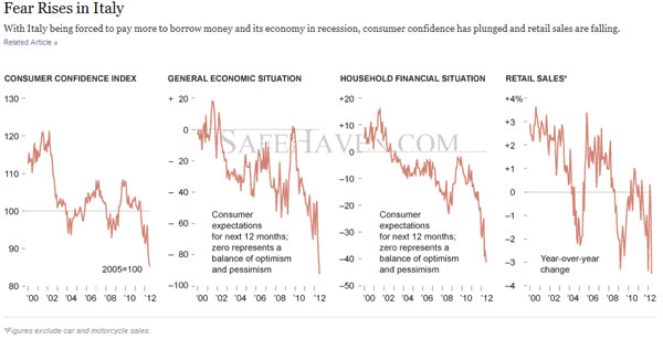 Consumer confidence is at multi decade ALL time lows set in April 1993. Retail sales, household financial situations and expectations are at decade lows, far below lows set at the DEPTHS of the 2008 Global financial crisis and the 2001 recession. These are BLEAK Black numbers from which there will be NO QUICK RECOVERY. NOW let's look at CREDIT demand in Italy and throughout the Eurozone: These are disaster numbers for ITALY, SPAIN and the Eurozone