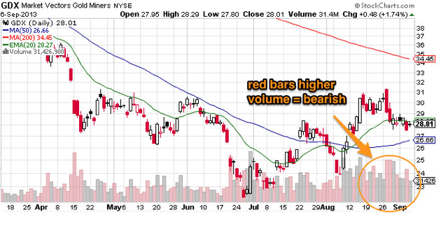 Both gold and silver are in a short term downtrend - the past 7 days both gold and silver have alternated between relatively large moves down, then up, then down again, but with a series of lower highs and lower lows that indicate a downtrend is in place. Silver appears to have support currently at 23 and bounced nicely today, while gold has twice bounced off a support zone between 1350-1360. But with the short term downtrend in place, we have to look for evidence of a reversal, which (for instance) would be a close above yesterday's high in both gold and the mining shares, preferably with some volume attached. The most recent bounce in silver looked good on the chart, but there wasn't much volume, so the signal is a little suspect.