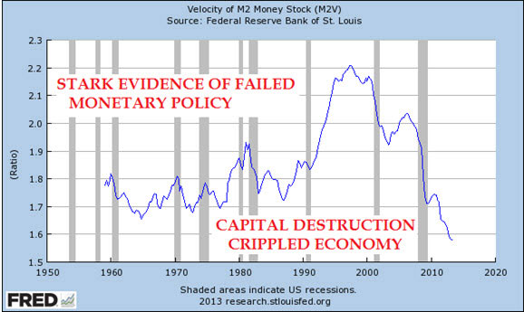 For two years or more, the USTreasury Bond market has been deeply dependent upon artificial demand derived from the derivatives. Entire bond rallies have been fabricated with 50:1 leverage, fully supported by the financial network propaganda. Without derivative flying buttress support, the giant USTBond Tower would have collapsed a couple of years ago. Now a new support system has been begun, a dangerous musical chairs long entrenched in the stock market. It has entered the bond market finally. Flash Trading!! The USFed, the USGovt, and the Big US Banks urgently needed to stop the move in the 10-year bond yield (aka TNX). They needed to prevent a move above 3.0% on the USTreasury yield. They needed to avoid a calamity with both Interest Rate Swaps and USTBond carry trade reversals. They needed to avoid a trigger of sell stops. They needed to prevent the rest of the world selling off USTBonds within their reserves management systems, the foundation of their national banking systems. So the USFed and Big US Banks called upon themselves to place artificial high bids on USTBonds sold among themselves in a circle jerk of Flash Trading. They pushed the TNX below 2.9% quickly in the corrupt process. USFed Chairman Bernanke then backed off the Taper Talk threat, and the USTBonds rushed in a pathetic rally. The Jackass forecasted his retreat exactly, a bluff after a failed trial balloon. The bankers then resorted to the hidden work of computer algorithms. They altered the constructive dynamics of the bond market. They corrupted it one deeper level. The Flash Trade defense is pathetic, and will be revealed in coming weeks. The United States is in the process of being isolated on numerous fronts, as its monetary policy has merged with its military policy, both having merged long ago with its banking policy. SICKNESS SEEN IN ONE POWERFUL GRAPH As preface, consider a highly telling graph. No graph better demonstrates the failure of the last five years in monetary policy, and absent USEconomic recovery. The falling Money Velocity means the system is collapsing gradually. The infusion of phony new money is not addressing the key fundamental problem, insolvency of banks, businesses, households, and the USGovt. Putting a $20 bill in the hand of a manager of a broken business does not remove the insolvent condition. It only enables the manager to pay a part-time worker another few hours. The clueless cast of corrupt economists cannot notice, nor admit, that the QE & ZIRP monetary policy (hammer & sickle) is destroying capital by raising the cost structure. The capital destruction comes from businesses losing their profit margin, shutting down a business or business segment, cutting jobs, and putting equipment in mothballs or liquidating it. This is the biggest blind spot to economic policy. Obviously, the economists serve the syndicate, which benefits from toxic bond redemption with free money. The USFed is not engaged in a stuck stimulus, but rather a stuck destruction. The hammer & sickle are symbols of communist Politburo, no difference in contrast to the planned financial structure in the Untied States.