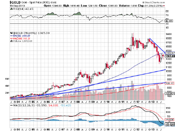 Anyway I believe that there are a lot of factors indicating that we are getting very close to a very strong rally of gold and silver. Look at the MACD of the monthly charts for gold and silver and imagine what could happen when the MACD turns positive again. Like the Chinese, the Indians are buying more and more gold (now also silver as the proxy of gold) as a hedge against inflation and the weak economy. Gold and silver are shifting from weak hands (the West) to strong hands (the East). Comex inventories are being depleted. Central banks want their gold repatriated (Germany, Poland, Finland). Whilst gold and silver are declining again despite the no-tapering, gold could chart technically go to $1,050 and possibly $700 and silver's support can be seen at $15, they will offer the investment of a lifetime because I don't exclude that we could see gold at $2,500 and silver at $100 next year. Most investment options are looking to be exhausted. We are entering the phase of preserving capital! September 20, 2013 © Gijsbert Groenewegen g.groenewegen@goldarrowpartners.com www.groenewegenreport.com |