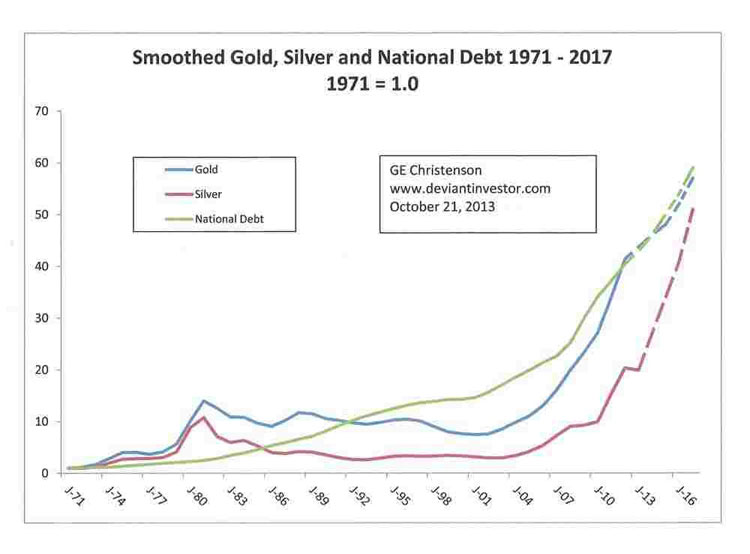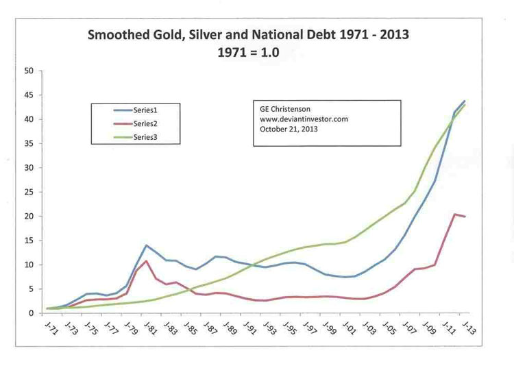And back in the real world where people work and support their families, life goes on, few noticed the lack of government "services," and in three months we will be blessed with another episode of our "Congressional Reality Show." Gold, Silver, and National Debt Examine the following graph. It is a graph of smoothed* annual gold and silver prices and the official U.S. national debt since 1971 when the dollar lost all gold backing and was "temporarily" allowed to float against all other unbacked debt based currencies. All values start at 1.0 in 1971. The legend does not show which line represents gold, silver, or the national debt. Why? Because it hardly matters! Government spends too much money to perform a few essential services and to buy votes, wars, and welfare, and thereby increases its debt almost every year, while gold and silver prices, on average, match the increases in accumulated national debt. Our 435 representatives, 100 senators, and the administration listened to their corporate backers and chose to increase the debt ceiling, continue spending as usual, not "rock the boat," and carry on with the serious business of politics and payoffs for another three months. It is safe to say that, on average, gold and silver will continue rising, along with the national debt, as they all have for the past 42 years. Further, like the national debt, both gold and silver (and probably most consumer prices) will increase substantially from here, until some traumatic "reset" occurs. What sort of reset?