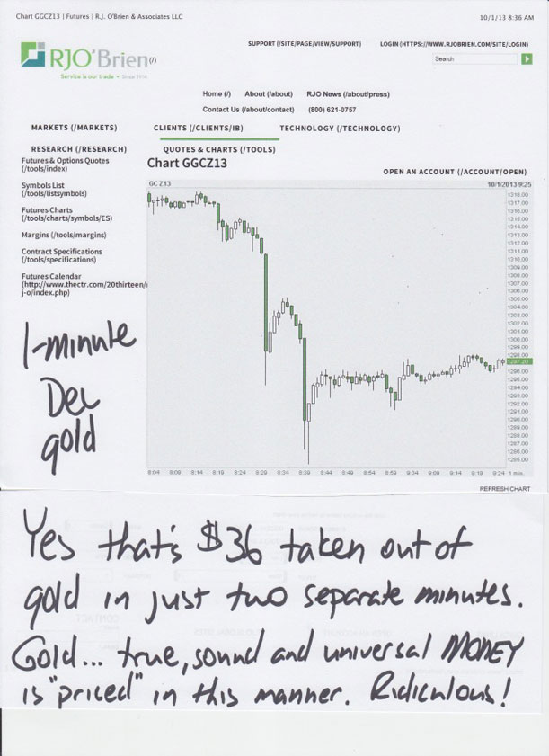 Now come the revelations that more than a year ago, two whistleblowers from inside J P Morgan provided the CFTC with detailed and specific information proving that firm's deliberate manipulative activities in the Silver markets (link). The CFTC sat on this information for more than a year, again noting only that their investigation was "ongoing". Then, on September 25, 2013, within days of the news of these whistleblowers being made public, the CFTC hurriedly announced an end to the investigation and stated that no charges were being filed. Directly following on the heels of the "no viable basis to bring an enforcement action" finding, the CFTC Director of Enforcement David Meister announced his resignation from the CFTC (link). Then the Wall Street Journal announced that Agency chief Gary Gensler reportedly also resigned, turning down the Obama Administration's offer to remain in charge at the CFTC for another five year term. He will be leaving his post within the year (link). All of these events – the CFTC ending a five year investigation, and the resignations of the Director and the Head of Enforcement – came within days of the public revelations regarding the CFTC's inaction despite the evidence presented by the whistleblowers. Meanwhile, clearly manipulative market activity is showing up in both short-term charts as our gracious host Turd Ferguson has noted…