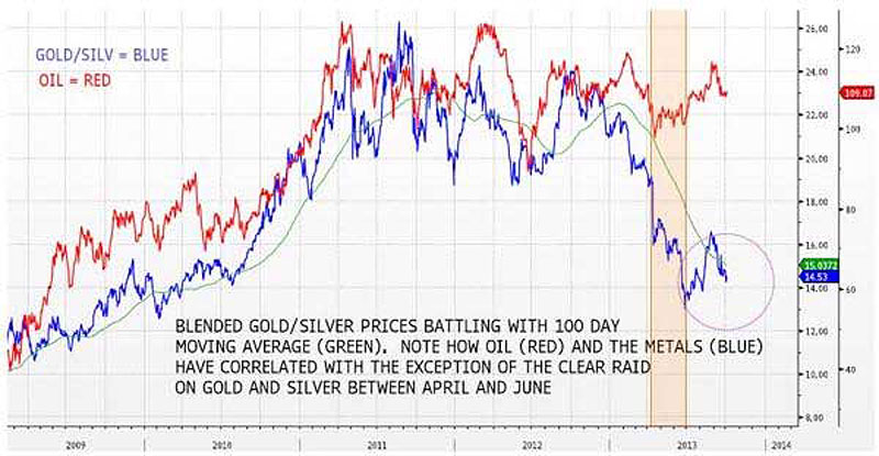 Cheviot Asset Management's Ned Naylor-Leyland created the chart above, and noted that PM price movements had been very strongly correlated with the price of oil for the last five-plus years… right up until 2013 and especially the period between April and June, where a $200 smash in gold was completely disconnected from any move in the oil markets, or indeed from any fundamentals whatsoever.