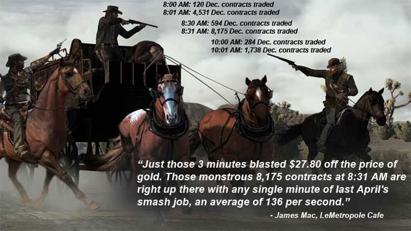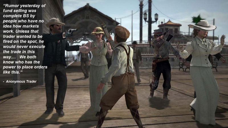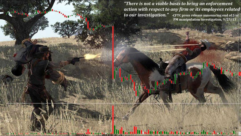 Precious metals markets are now the Wild West: a lawless territory where the Judges are bought and paid for, and where brutal and rapacious men are allowed to pillage the populace at will, unchecked by the rule of law. The Sheriff is too cowardly to emerge from his office, let alone do anything to go after the bad guys. He slumps impotently behind his desk, mourning his receding hairline and hoping against hope that nobody brings in more evidence of wrongdoing- not because he would then have to do something (there is no crime so egregious to cause him to bestir himself) but because such revelations make his inaction and cowardice even more publicly humiliating than they already are. Meanwhile, the townsfolk are realizing they are completely on their own. They stay inside and keep their heads down, trying not to get preyed-on by the gangs of sanctioned looters roaming the territory. The smart ones are quietly stacking all the gold and silver bullets they can lay their hands on, knowing that they and they alone are responsible for their own safety. The rest go about their lives unarmed and uncertain. They would do well to heed the words of William Muny who, when accused of shooting an unarmed man, looked slightly baffled by the charge and replied matter of factly "Well… he should'a armed himself." |