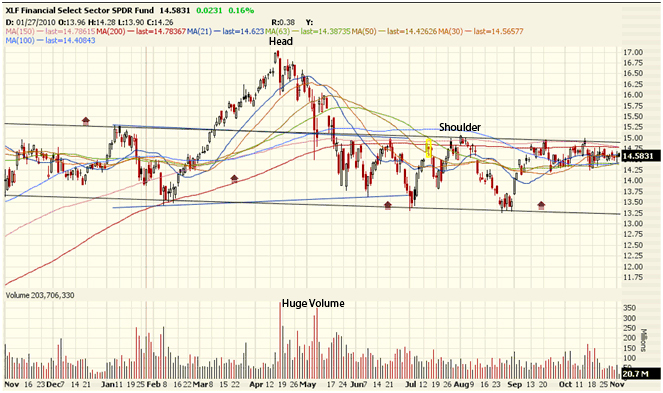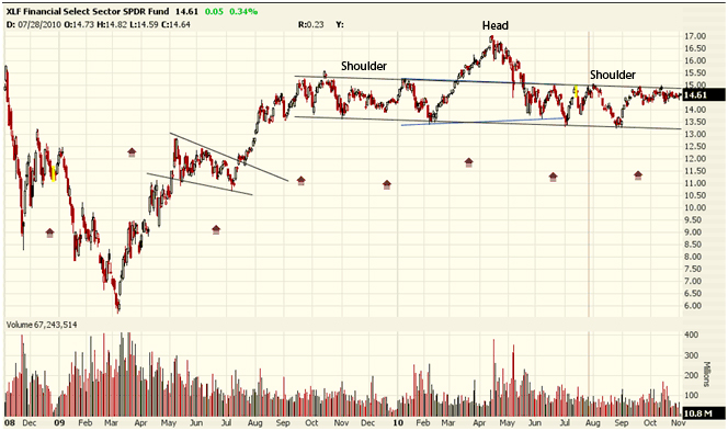 The financials got us into this mess...and they may drag us right back into it. We seem to have to forgotten how bad things were with banks and financials a few years ago. Lehman, Bear Stearns, and a multitude of banks went bankrupt; the problems at the root of this debacle were still not fully dealt with; financial stocks are lagging; and Wall Street bonuses are still setting records! Financial stocks took such a beating that anyone who bought Bank of America (BAC), Goldman Sachs (GS), Citigroup (C), JP Morgan (JPM), or any among a huge selection of other financials, has seen his or her returns exceed hundreds of percents! With a market that, on average, returns about 8 percent a year, having the largest financial stocks resurrected and returning 200 to 1000 percent is unheard of! But as financials rebounded, carried the market back up, and eased the economy from its extreme panic of 2008, it did so by sweeping all the problems under the rug. By pushing off many of the issues concerning the lack of transparency, complicated and dangerous derivatives (such as mortgage-backed securities), and the utter disregard for their investors and the economy as a whole, all the financials ended up doing is buying more time. And as that time runs out, and reality starts to set in, the panic will once again follow. Take a look at a chart of the (XLF), an ETF that measures the financials as a whole. After dropping from over $34 in 2007 to under $6 in 2009 (an over 80 percent drop!), the financial sector rebounded strongly to a high of about $17 in April 2010. Such an almost-perfect rebound gave the market some confidence for a while; but as anxiety sets back in now, there may be a chart-pattern that warns us of potential collapse. First off, regardless of the pattern we will discuss, it is important to notice that the financials have actually been lagging the overall market over the past few months. While the S&P 500 has seen double-digit gains over September and October, the financials (XLF) have been struggling to break out of their range. Looking at the chart above, you can see the nice run-up the financials had from their March 2009 low to the April 2010 high. But along the way, and following the April-August downturn, it appears financials have formed an almost-deadly pattern. The head and shoulders pattern now stands in the way of a financial growth period. The head and Shoulder pattern is a reversal pattern that generally appears at the end of a big market move. In our case, after the huge run-up in financials off of the 2009 panic bottom, the head and shoulders pattern has formed and may be on the verge of confirming a new recession. Taking a look at the pattern, we can see investor emotions. The first shoulder on the left represents the first instance of investor anxiety within the pattern. As investors realized that financials have had such a huge run from March 2009 up to that point in October 2009, fear about a potential fall prompted some investors to sell their stake. But there were others who ended up buying the dip, which found its low in February 2010. Those who bought the dip in financials helped start another run-up that ended up seeing new highs in April 2010 - This run-up represents increased investor confidence that financials may be recovering and carring the market further. After the second round of buyers and sellers made their move, however, a new group of sellers came in and realized Finacials may be overbought here again in April 2010. If financials were sold off in October 2009 when the price was even lower, why should they continue to rise in April 2010 at a higher price? For that reason, along with extreme anxiety concerning the Goldman Sachs case as well as the BP oil spill troubles, sellers came back into the market in droves! If you take a look at the Volume in April and May, you'll see the bars are much bigger at that point that at any point since around the March 2009 low. Such high volume in selling shows us some capitulation by investors and conviction in the downward move.