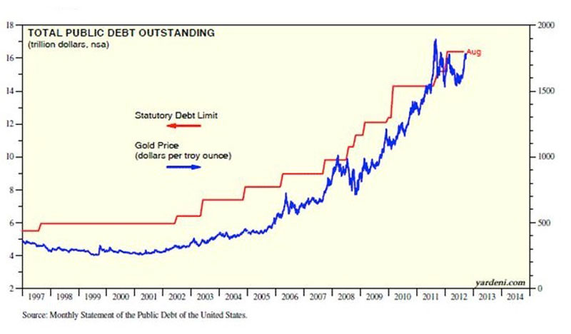 These words were spoken a half-century ago. Yet today, this is still the root of all of the world's major financial problems. Governments have tried to alter our reality to the point that we accept that central banks and, most notably, the Federal Reserve, have the right to create currency out of thin air while the rest of the population exchanges blood, sweat, thought and emotion for that same currency. This wouldn't seem fair to a Neanderthal, yet today most of us accept it as the norm. Many have joined the banking matrix, even though it has nothing to do with common sense. I chose the controversial title of $10,000 Gold only after watching the 2011 debt-ceiling fiasco, because it was clear then that there would never be a serious attempt at reducing debt until the entire system implodes. The October 2013 debt-ceiling debate, which accomplished nothing other than removing the debt-ceiling limit for the next three months, further confirmed that only financial disaster would bring a new system. Washington's decision makers lack the understanding and political will to avert such a disaster. I sincerely doubt that the Fed will ever voluntarily taper its quantitative easing program. My view is shared by many in the gold community, but by very few mainstream financial commentators. The main thesis of the book is that gold will continue rising because several exponential, long-term and irreversible trends will continue forcing the need for greater and greater government debt, and government debt is the main driver of the price of gold, as we can see in Figure 1. For the past decade, debt and the gold price have shared a conspicuously close relationship.