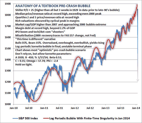 No, Lacy, that is not undeniable. I just did. And I have to wonder: why would you say that? Why would anyone? Do you really believe all you said there? That this entire group of more than average intelligent people make all these mistakes, and misinterpret all of these signals, despite having more and better access to data than anyone else, and you still don't wonder if perhaps they're not trying to do what they say they are? How can you claim to be an analyst if you don't even question your most basic assumptions? How is that analysis and not apologism? John Hussman writes some good market opinion, but he sort of falls into the same apology trap: It’s fascinating to hear central bankers talk about the economy, because in the span of a few seconds they can say so many things that simply aren’t supported by the evidence. [..] quantitative easing essentially proposes that rapid increases in the monetary base can achieve reductions in the unemployment rate. But when we examine the data, we find very little to support this view, regardless of whether the relationship is posed in terms of growth rates, levels, changes, coincident changes, or subsequent changes in unemployment. [..] In my view, most of the response to quantitative easing reflects psychological factors rather than mechanistic ones. Certainly the scale of QE has been enormous, and suppressed short-term interest rates have undoubtedly motivated a reach-for-yield in more speculative assets. But it remains true that the amount of credit market debt in the U.S. is roughly 19 times the current size of the monetary base (with an average maturity of about 5-6 years), while the value of U.S. equities is easily over 6 times the monetary base. So quantitative easing effectively relies on the extent to which investors shun zero-interest cash amounting to less than 3.9% of that available portfolio. In any environment where low-interest but liquid and non-volatile securities become desirable as even a small part of investor portfolios, quantitative easing is likely to lose its presumed ability to "support" financial markets. [..] The truth is that Fed policy has the capacity to do enormous damage by adding fuel to asset price bubbles when investors are already inclined to take risk, yet has very little power to "support" asset prices when investors are inclined to avoid risk. The confidence that the Fed can, in all circumstances, drive asset prices higher is largely psychological – mostly due to misattributing the 2009 recovery to monetary policy instead of the move to end "mark to market" accounting. Yet even to the extent that stocks have been driven higher, there is very little evidence that the "wealth effect" on jobs and economic activity has been large. This is something that the Fed should have understood years ago. [..] I continue to believe that it is plausible to expect the S&P 500 to lose 40-55% of its value over the completion of the present cycle, and suspect that whatever further gains the market enjoys from this point will be surrendered in the first few complacent weeks following the market’s peak. See? they're doing everything wrong. Ergo: boy, must they be stupid. Only, that second part is left out. What I do find interesting is Hussman's last claim: that it's plausible to expect the S&P 500 to lose 40-55%. And he's got a nice graph to show where things stand: