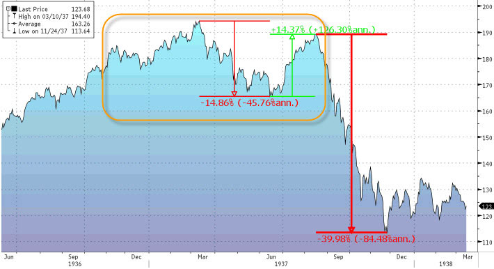 But when we look at the headlines in the Wall Street Journal from mid 1936 to mid 1937 as the market topped out, dipped, was bought back (orange oval), then collapsed 40% in 3 months, nothing ever changes...