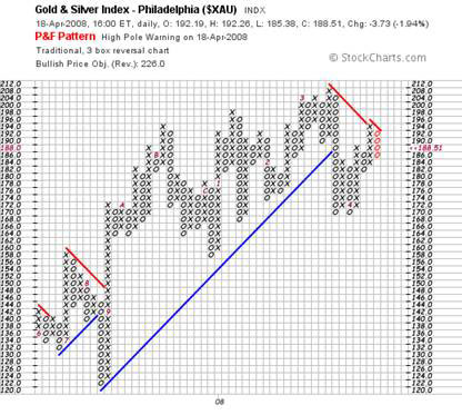 Next up is the point & figure chart for the Hui. It shows a double bottom breakdown on April 18, 2008. It gives a bearish price projection of 388, which is a ways below. Note it is just below the 400 price level mentioned above. The Hui chart does not jibe with the GDX or XAU charts, so either the Hui is correct or the others are correct. We await the outcome, which is why we took profits on most of our positions this past week. It seemed the prudent thing to do. There appeared to be a shift in momentum so we took the money and ran. The point & figure chart for the Xau follows the Hui