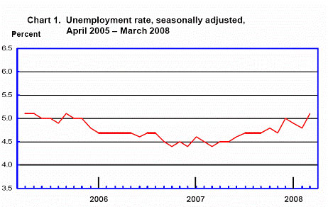 Commodities - Boom or Bust Economy The Bureau of Labor Statistics reported that unemployment was up from 4.8 to 5.1 percent during the month of March. Nonfarm payrolls lost 80,000.00 jobs. Average hourly earnings were up 5 cents or 0.3% for the month of March.