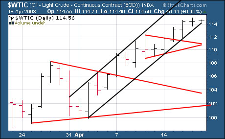 The IMF states that losses from the credit and derivative mess may run as high as almost $945 billion dollars, which isn't chump change. Have real estate prices bottomed out yet - no, not by a long shot. Foreclosures were up 57% over the last year and bank repossessions were up 120%. There's no inflation if you don't have to buy food, oil, or gas. Food shortages are occurring worldwide. The price of rice is up almost 150% in the last year. People get a bit angry when their kids are starving. Such conditions do not auger well if allowed to continue. Vice President Warsh of the Fed said that "we also need to be alert to risks to price stability," blaming higher food and fuel prices that are "putting upward pressure on core inflation and inflation expectations." Janice Yellen, former Fed governor and chairman of the White House Council of Economic Advisers, told reporters that the Fed "will have to be careful not to leave monetary accommodation in place longer than it is needed." The three-month London Interbank Offered Rate (LIBOR) rose from 2.73 percent to 2.91 percent today. This rise reflects growing concern to risk. Look for more and more city and state revenues to be under attack from the mortgage related contagion. What has occurred in Florida, Alabama, and California is the tip of the ice-berg. Commodities Commodities have been on a tear as of late, from oil to natural gas, to the metals and the agriculture commodities. Rice is going ballistic. Today the commodities took a long overdue hit to the downside, as they seemed to be about too. During the week we exited almost all of our positions in the commodities. We got lucky and it worked out well. As stated earlier, if the euro rises it will be good for the commodities. If the dollar rises it will not be good for commodities, especially the precious metals. Up next is the daily chart of oil. It shows its bottom trend line being tested. If breached below there is significant support at 110.