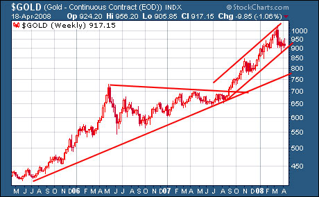 Gold Gold was down a little over 1% for the week, closing at 916.20 (spot prices). Below is the weekly gold chart, with continuous prices, not spot. It shows a bullish uptrend in price where the bottom trend line of the rising channel is being tested. If it is broken through on a two day closing basis, it is most likely the correction will continue down to the 850.00 level. For the intermediate and long term trend this short term correction would actually be very constructive for gold, as it will wash out a lot of the weak hands and speculators, placing gold into strong hands. A stronger base will then form, which will allow for a more sustainable and powerful new phase (wave) to launch off from. The longer and stronger the base - the more powerful and longer lasting is the next move up. If gold makes a direct assault on the $1000 price level from here, it will not likely last for as long of a time, and to the degree that it would if a lower and more solid base is first formed. $900 hundred or there about is the level to watch - if it is broken below 850-800 is very probable. It will offer a great buying opportunity. I like to buy fear and sell greed, but that's just me.