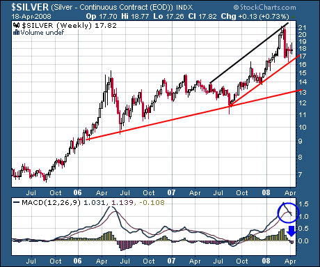 The recent rally up was on declining volume, which is a sign that buying pressure and momentum is waning. Caveat Emptor. Also, there may be an overall commodities correction waiting to take hold. The action of the euro and the dollar will be most telling. If the euro rises against the dollar - gold and the other commodities will go up. If the dollar rises against the euro, gold and the other commodities will go down. Watch the currencies for clues as to the short term direction of the gold market. Intermediate and longer term trends still remain strongly in force - up. Silver Silver was up fractionally for the week. This is a positive divergence, although minimal and it needs further confirmation. The daily chart shows the bottom trend line support area being tested. On the weekly chart a negative MACD cross has been put in.