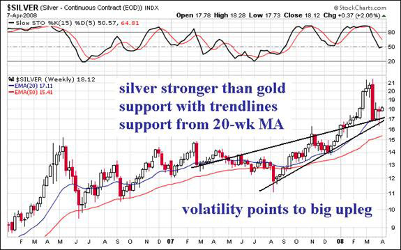 The USFed has essentially become a bond pawnbroker in a bad neighborhood dominated by white collar criminal looters, where the police get ripe payoffs. The compromised central bank has limitations, and soon could run low on balance sheet quality. They stepped into the banking void and filled it. Unfortunately, they did so with reckless abandon as they exposed the corrupt nature of JPMorgan, its extreme vulnerability, and has encouraged those with access to the USFed lending facility windows to execute similar raids. This is a moral hazard of another ugly side, yet high order. Next comes USGovt massive stimulus, larger than the puny $600 per household, construction finally of the New Resolution Trust Corp in the mortgage complex, and grand spillover into the USEconomy. The USTreasury yield curve has flattened lately, explained in the April HTL issue. The USFed must juggle its balance sheet. If foreigners do not abandon the USTreasurys and USDollar, the yield curve will flatten further. A recession would keep long-term bond yields down, but also motivate foreign sellers. THE NATIONAL BALANCE SHEET IS WRETCHED. So an increasing number of banks have negative core capital, an increasing number of homeowners have negative home equity, and an increasing number of car owners have negative car equity. The USGovt runs gargantuan federal deficits, and the USEconomy runs mammoth trade deficits. The entire USEconomy is fighting desperately to avoid insolvency and bankruptcy. The USFed and USGovt response will be a powerful wave of monetary inflation for a few years. The result will power gold and silver to unexpected heights. A detail. Did anyone notice that the March Jobs report details? Even though at MINUS 80k jobs in the non-farm payroll count, a hefty job loss to be sure, it could have been worse. The final tally was heavy doctored by the lunatic Birth-Death Model, which added 142k jobs from small businesses supposedly thriving in this environment. Are you kidding me? The March Jobs should have been MINUS 222k jobs. The same was true of February. Its B-D Model added 135k jobs from a thriving small business climate. Are you kidding me? The USFed must be panicking. They will cut rates again and again, until they have no ammunition left. They will soon print money and monetize their refunding operations. The USDollar will be under siege. But fortunately for the downtrodden buck, foreign economies are slumping. Foreign central banks will also be cutting official interest rates. The USDollar will find support from global rate cuts, which will send gold and silver prices soaring again, but on more continents. It is basically 'Inflate or Die' still. Gold Will Ride the U.S. Fed Surfboard Gold was ambushed in mid-March. The motivated authorities were sweating bullets. They ordered banks to deliver margin calls. Speculators led by hedge funds were forced into broad liquidation. However, the trend is intact. The moving averages are rising. Support has been found. The gold price had a deep reluctance to stay under the 900 level. Stability has returned, enough to start the creation of a new base. The big breakout since August has now registered two noticeable corrections in classic style, a small one followed by a large one. With nothing having been solved on US bank problems, and USEconomic recession worsening, the additional stimulus and rabid monetary growth will send gold flying again soon. Look for an assault on the 1100 level within two or three months.