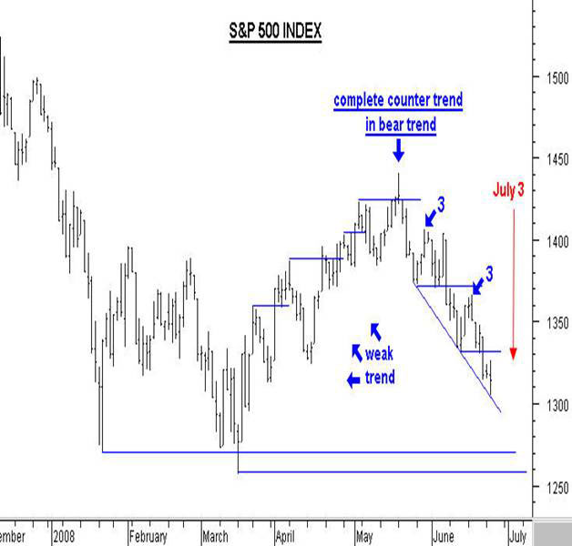 Source: www.finance.yahoo.com In June alone the Dow Jones Industrial Average was down 9.4% and that is the worst June performance since 1930, the year the Great Depression really took a grip on the US, and yet no one is worried. I am more than amazed, I am bewildered and perplexed. There are warning signs everywhere for anyone to see and yet we stumble through life like a nation of blind men and women. Secure in the “knowledge” disseminated widely on CNN that it will somehow all work out; we go through our daily lives convinced that the bottom is at hand. The markets have taught me though that unfounded convictions pave the road to bankruptcy, and are second only to “hope” when it comes to the destruction of capital. When it comes to the markets, I never hope and try not to develop emotional attachments to my positions. Most analysts come at you like Moses coming down from the mountain with a set of stone tablets, but nothing is that certain in the financial world. Investors are about to learn that the hard way. For the most part recent developments in the Dow Jones Industrial Average has silenced the financial news cheerleaders for the moment, but rest assured they’ll be out in full force on Monday. It was a difficult week made worse by a wishy-washy Fed statement that declared “economic activity continues to expand” while inflation should “moderate later this year and next year”. The stock market is always quick to recognize manure when it sees it and this was no exception. The Fed statement came out on Wednesday at 2:10 pm EST and was followed by a one hour rally that took the September Dow as high as 11,915. Then selling set in and continued right on through Friday’s closing bell. On Friday the September Dow futures contract closed down 105 points at 11,357 and that is a new bear market closing low. A look at the one-year daily chart above clearly shows a pattern of lower highs and lower lows dating back to the October all-time closing high. [Really it dates back to the July high as October was a false break high.]