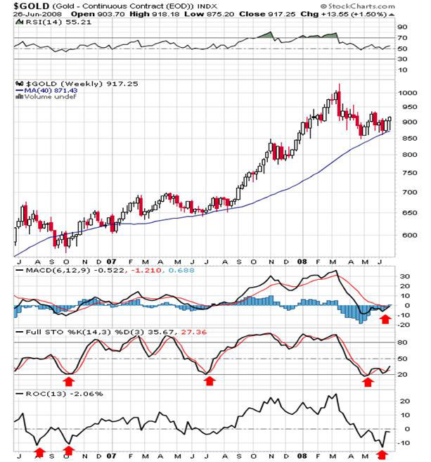 Those who wish for a dollar rally had better be careful what they wish for. A dollar rally can only happen with deflation, and deflation in a country swamped with debt would be absolutely devastating. I believe the Fed is reduced to doing nothing here. They set the wheels of inflation in motion and now will stand back at let the rest of the world deal with it. They certainly cannot, will not, raise rates or contract the money supply. They must continue to print under any circumstance. If the rest of the world raises rates then it will drive the dollar down and the Fed can blame them. In short, they are reduced to finger pointing (as are the Europeans). We’ve already seen signs of it as two major European banks (Royal Bank of Scotland and Barclays) are now blaming the Fed for current credit and inflation problems. I have been in the inflationary camp for two years but never comfortable with it. From 1999 to late 2005 I believed we’d see deflation, and now that everyone is calling for inflation, I am drifting back toward that camp. I am convinced that the next move in the US dollar will finally decide the issue once and for all so keep your eyes open. So what do you do given the fact that the US has almost no say about its economic destiny and we appear to be headed for a significant inflationary bout, always keeping in mind though that deflation is possible? You do what the smart money does; you buy gold. The yellow metal, and silver to a lesser degree, is the one thing that has stood the test of time. From time to time the human race has traded shells, beads, gems, tulips, and the like but it has traded gold/silver for more than five thousand years, and always as a store of value. I believe that gold is in fact the only true store of value and that’s why people turn to it during times of inflation (1974 to 1981), deflation (1930 to 1932), war, famine and natural disasters. People have been killed for it and wars have been fought over it. To the best of my knowledge, no one fought a war over a tulip. Lately there has been a lot of talk about the bull market in gold and a number of analysts have espoused the opinion that gold’s rally was extremely overdone and is now headed for a significant decline. The 731.00 level seems to be the target of consensus. I of course disagree vehemently. I just don’t get up in the morning and look for windmills to tilt at, although it may seem that way. I do though spend an awful lot of time looking at charts, reading about the history of gold, and calculating support/resistance levels. I also spend considerable time trying to determine which support/resistance levels are important and which are less than significant. Everybody comes up with more or less the same numbers but very few can decipher the significance, or lack of it, for each number.