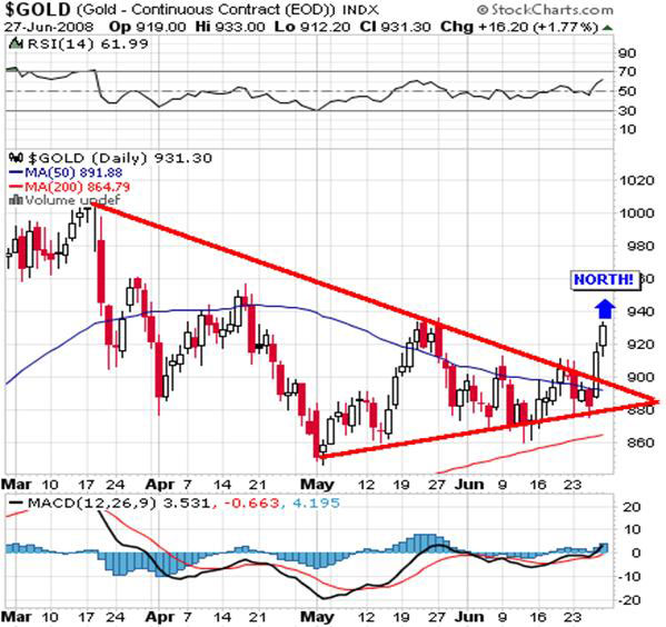 The preceding weekly chart for gold does not include Friday’s 16.20 gain in gold, but is quite illustrative in any event. You can see that the price of gold has held nicely above the 50-wma and the RSI, MACD, and histogram have all turned up. Also, note the two series of three red arrows below and you’ll see that gold has bottomed precisely where it did in previous occasions. What is even more telling is the fact that this particular correction was quite shallow (15.4%) versus the expectations for a 25% correction shared by most analysts. As a result, many folks are now sitting on the sidelines with their hands in their empty pockets wondering what to do now. A look at the daily chart below shows that gold has broken out to the upside. Draw a line from the $1,033.90 top, have it connect to the $935.40 peak, and then continue on to the right and you’ll see that gold is now trading well above it:
