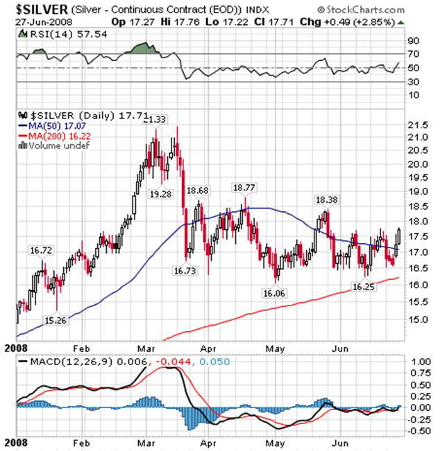 If and when these people decide to get back in the market, and they will, it could easily propel gold back up to test strong resistance at 999.40. I want to make it clear that gold’s has bottomed, did break out of a compressed trading range just like in August 2007, and it is headed higher. As you can easily see on gold’s weekly chart, it is a long, long way from being overbought. Finally, we see that silver is in a similar pattern but is lagging gold. The real work to the upside will begin when silver takes the lead from the yellow metal and that could still be weeks away. From a technical perspective, silver looks better with the RSI, MACD, and histogram are headed up. When I look at silver’s daily chart, I see a long period of accumulation following an initial decline.
