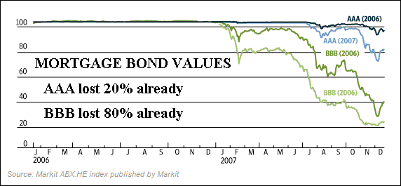 As a preface, one should know that politicians did not advance this plan. The key initiators of the HOPE NOW project were three banks. It was an alliance led by the Federal Deposit Insurance Corp (insurer of banks), along with big banks and their lobbyists from Citigroup, JPMorgan, and Wells Fargo. These banks in my opinion are insolvent, soon to be forced into bankruptcy as the next round of the mortgage debacle unfolds from the 'innovative' adjustable and option laden mortgages. They all face bankruptcy, insured by the FDIC. If lawsuits are filed and that road is traveled, declared bankruptcy is assured. The rescues to save the Ruling Elite will lift gold and trash the USDollar, as much from a new unprecedented round of monetary inflation, as from destroyed image of the US financial system. Freezes never work. When in college, my memory is vivid of the lunatic Nixon Wage Price Freeze. When it lifted, the price inflation rampage was the worst in modern history. My suspicion is that when any mortgage freeze is lifted, both mortgage rates will rise sharply and mortgage bonds will fall sharply in value. Few have bothered to think about the infectious disease of moral hazard, to consumer and household reactions. Many economic participants will feel left out with the current rescue, against a backdrop of watching colossal fraud go unpunished. They will possibly act destructively, an intentional effort to destroy their credit rating so they can participate in national bailouts. Many live in homes with negative home equity. They might feel above the rules, immune to impact of their actions, engrained in destructive habits, feel powerful from a reprieve, want to be included, or just not care. They will feel they have nothing to lose. The likelihood that property taxes will be paid, water & sewer fees paid, lawns mowed, hedges & trees pruned, garbage removed, broken windows repaired, holes in walls filled, driveway cracks filled, shingles straightened, liens on the property resolved, these are all in doubt in my book. Pride in ownership will turn ugly, into a free ride game. Practicalities are strained to the extreme. A zombie comes to learn to act with disregard, disrespect, and disobedience. Henry David Thoreau wrote 'Civil Disobedience' almost two centuries ago in response to the Spanish Civil War, yet another false flag self-inflicted attack. That was done to the USS Maine vessel off the Cuban coastline. Expect such disobedience to be practiced widely in reaction. NOT A SUBPRIME PROBLEM ANYMORE If 'AAA' rated mortgage bonds have lost 20% already, this is not a subprime problem anymore. My contention is that many 'AAA' bonds are likely to lose over 50% of their value, as home collateral value drops another 10%. Wells Fargo announced a whopping $1.2 billion loss from prime second mortgages recently. Remember how people could borrow their entire down payment with an immediate 20% second mortgage out of the gate? Well, they are failing, with Moodys estimating 15% of them to fail. That is on par with the horrendous subprime default rate. The E*Trade bond loss writedowns were not subprime. After taxes and cash infusion is removed from Citadel Investments, the E*Trade fire sale salvaged only 11 cents per dollar on their $3.1 billion prime mortgage bond portfolio. The liquidation damaged the entire market by exposing its low value. This is not a subprime mortgage problem anymore. The debt ratings agencies writedowns have entered a second gear, with some acceleration. They are not only downgrading massive bank portfolios, they are threatening to downgrade the bond insurers such as ACA Capital and MBIA, as well as others. What is a house or business worth when it cannot be insured due to faulty structures? NOT MUCH!!!