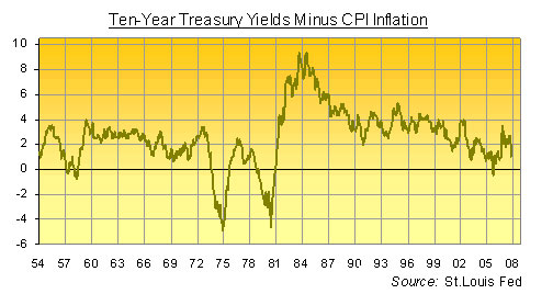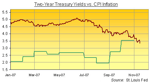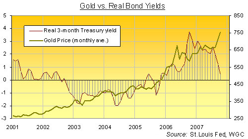 US government bond yields have now sunk so far, so quickly, that on Thursday this week - in a little-noticed event - they slipped below the latest reading for US inflation. Yes, even on the Dept. of Labor's much-despised Consumer Price measure, the cost of living in America in October was officially higher than two-year Treasury yields today. Two-year yields have dropped by more than 0.5% over the last month. They're dropped by nearly 1.5% since November last year. CPI inflation, on the other hand, has risen from 2.0% in January to above 3.5% last month. In short, two-year Treasury bonds are now deemed so desirable - because the subprime mortgage disaster demands such aggressive Fed rate cuts - that investors are willing to let inflation destroy their wealth. (Or rather, the wealth of their clients...) And why not? Everyone thinks Ben Bernanke will jump at the ghost of '30s deflation before he dares shadow-box the threat of '70s inflation. No doubt the world and his broker are right too, given his academic obsession with stopping the Great Depression seven decades after it happened. Just maybe Bernanke's right, too. Maybe the housing slump - and the resulting loss of consumer spending - really do threaten such an ugly unwinding of US debt, the economy will slip into deflation. The major challenge to that view, however, is the ongoing rise in the cost of living, driven the surge in energy and food prices that's now being send east across the Pacific from China. And given the slump in bond yields vs. this rise in official US inflation rates, what might it mean for Gold Prices?