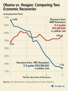 The Obama Administration stumbled badly with their first major promise. We were told that if the stimulus package was passed, unemployment would not exceed 7%. It was passed and unemployment soared over 10%. The package had no promised shovel-ready jobs and turned out to be the biggest pork bill ever. Virtually nothing went to Main Street to help individuals. Unions, government employees and other Democrat constituents were the primary beneficiaries along with the banking industry. President Reagan, like President Obama, inherited a difficult situation when he entered office. To the right is a comparisonof what happened under Reagan and under Obama. The chart compares unemployment rates. Changes in the manner in which unemployment is currently measured favorably distort the unmitigated disaster that is Obama’s economic policy. Adjusting data to the same basis, would make the comparison even worse.