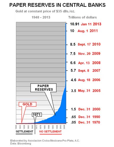 To argue with Ambrose Evans-Pritchard is risky. He is well informed, he has travelled much, writes well and has a sharp intellect. Yet I must affirm that he is mistaken in some of the opinions expressed in his recent article at The Telegraph, "A new Gold Standard is being born," January 17, 2013. In the article he refers to the "(old) Gold Standard dynamic at work with all its destructive power, and the risk of sudden ruptures always present." I take it that he refers to the pre-WW I Gold Standard, and the financial chaos that broke out in 1930, to which he refers as "the destructive power" of the Gold Standard. That chaos should not be attributed to the Gold Standard as it existed but to the previous expansion of credit in violation of the rules of the Gold Standard. The pain of the 1930s was the correction which the Gold Standard imposed upon the financial diddling with credit expansion which the Powers had adopted; what was "destructive" was their policy of credit expansion beyond savings. If you stick your finger in the fire, don't blame fire for its "destructive power"; just refrain from doing that. Ambrose writes: "The global system is supple. It bends to pressures." Actually, there is no "global system." There is at present only a global process. A system has, by definition, parameters. A system is like a billiard table with no pockets. The parameters are the boundaries of the table beyond which the billiard balls cannot move. The parameters of a system ensure its stability and endurance through time. A process, on the other hand, has a beginning, a mid-point and an end, like cooking a steak, or like a firecracker. You light a firecracker; then you have the explosion as the powder ignites instantaneously. The process ends when the exploding gases collapse. A process does not endure. From Bretton Woods (1944) to 1971 the world had a system, albeit a defective and fragile system. There was a parameter which could not be violated: The US solemnly promised to redeem dollars held by foreign central banks for gold at the rate of $35 dollars per ounce. That was a system that held world credit expansion down to a modest rate up until 1971, when Nixon decided to renege on the promise. (See graph of "International Central Banks, excluding gold.")