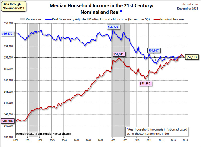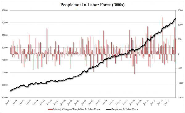 The media mouthpieces for the establishment gloss over the fact average gasoline prices in 2013 were the second highest in history. The highest average price was in 2012 and the 3rd highest average price was in 2011. These prices are 150% higher than prices in the early 2000′s. This might not matter to the likes of Jamie Dimon and Jon Corzine, but for a middle class family with two parents working and making 7.5% less than they made in 2000, it has a dramatic impact on discretionary income. The fact oil prices have risen from $25 per barrel in 2003 to $100 per barrel today has not only impacted gas prices, but utility costs, food costs, and the price of any product that needs to be transported to your local Wally World. The outrageous rise in tuition prices has been aided and abetted by the Federal government and their doling out of loans so diploma mills like the University of Phoenix can bilk clueless dupes into thinking they are on their way to an exciting new career, while leaving them jobless in their parents’ basement with a loan payment for life. ![]() The laughable jobs recovery touted by Obama, his sycophantic minions, paid off economist shills, and the discredited corporate legacy media can be viewed appropriately in the following two charts, that reveal the false storyline being peddled to the techno-narcissistic iGadget distracted masses. There are 247 million working age Americans between the ages of 18 and 64. Only 145 million of these people are employed. Of these employed, 19 million are working part-time and 9 million are self- employed. Another 20 million are employed by the government, producing nothing and being sustained by the few remaining producers with their tax dollars. The labor participation rate is the lowest it has been since women entered the workforce in large numbers during the 1980′s. We are back to levels seen during the booming Carter years. Those peddling the drivel about retiring Baby Boomers causing the decline in the labor participation rate are either math challenged or willfully ignorant because they are being paid to be so. Once you turn 65 you are no longer counted in the work force. The percentage of those over 55 in the workforce has risen dramatically to an all-time high, as the Me Generation never saved for retirement or saw their retirement savings obliterated in the Wall Street created 2008 financial implosion.
