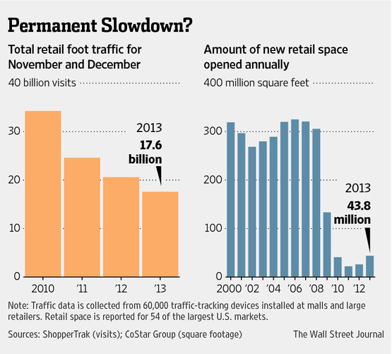 The entire economic recovery storyline is a sham built upon easy money funneled by the Fed to the Too Big To Trust Wall Street banks so they can use their HFT supercomputers to drive the stock market higher, buy up the millions of homes they foreclosed upon to artificially drive up home prices, and generate profits through rigging commodity, currency, and bond markets, while reducing loan loss reserves because they are free to value their toxic assets at anything they please – compliments of the spineless nerds at the FASB. GDP has been artificially propped up by the Federal government through the magic of EBT cards, SSDI for the depressed and downtrodden, never ending extensions of unemployment benefits, billions in student loans to University of Phoenix prodigies, and subprime auto loans to deadbeats from the Government Motors financing arm – Ally Financial (85% owned by you the taxpayer). The country is being kept afloat on an ocean of debt and delusional belief in the power of central bankers to steer this ship through a sea of icebergs just below the surface. The absolute collapse in retail visitor counts is the warning siren that this country is about to collide with the reality Americans have run out of time, money, jobs, and illusions. The most amazingly delusional aspect to the chart above is retailers continued to add 44 million square feet in 2013 to the almost 15 billion existing square feet of retail space in the U.S. That is approximately 47 square feet of retail space for every person in America. Retail CEOs are not the brightest bulbs in the sale bin, as exhibited by the CEO of Target and his gross malfeasance in protecting his customers’ personal financial information. Of course, the 44 million square feet added in 2013 is down 85% from the annual increases from 2000 through 2008. The exponential growth model, built upon a never ending flow of consumer credit and an endless supply of cheap fuel, has reached its limit of growth. The titans of Wall Street and their puppets in Washington D.C. have wrung every drop of faux wealth from the dying middle class. There are nothing left but withering carcasses and bleached bones. The impact of this retail death spiral will be vast and far reaching. A few factoids will help you understand the coming calamity: