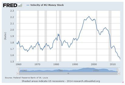With all of these dynamics, people and businesses understandably hold on to the money they have in order to meet their most urgent life sustaining needs. In other words, monetary velocity (how rapidly money turns over) decreases. One of the reasons I believe John Williams is right in suggesting that we never came out of the 2008-09 recession is because current monetary velocity is continuing to plummet as shown by the chart from the Federal Reserve Bank of St. Louis on your left. I believe this picture is consistent with statistics that show America's middle class is very rapidly disappearing. We are even reading now that Americans are building up debt simply to buy food and gasoline for their cars. To the extent that trend grows and continues, the American economy is a train wreck waiting to happen.