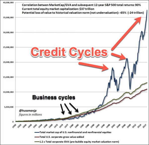 This is why the ‘recovery’ is not really a recovery. It’s not based on anything organic or healthy. It’s simply borrowed and all borrowing sprees eventually come to an end. Looked at from a stock market perspective, here’s what central bank inspired credit cycles look like: