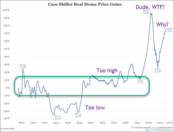 In every case so far, every attempt to halt QE has resulted in a Wall Street hissy fit and a lot of crybabies in the investing world demanding that the central banks reverse course. And each time they did, and it worked for a little bit longer. So here we are, and everybody wants to know what comes next. That’s easy. Until and unless the central banks reverse course, once again, and make the next round of QE even larger and more bigly than any previously, we’ll see lots of declines in financial asset prices. Only this time? It won’t be constrained to falling stocks – it will envelop everything. A Fed Too Far Crass, and vulgar, and utterly indefensible. That’s the only way to describe the combined “leadership” of Ben Bernanke and Janet Yellen who conspired to throw an entire generation under the bus, along with the elderly on fixed incomes and savers too. Millennials were locked out of first time homebuying by an interventionist Fed that decided all on their own that those already living in houses should be made to feel wealthier by virtue of rising home prices. Instead of noting that the 2001 – 2007 housing bubble was a very bad idea, the Fed printed up $1.75 trillion of fresh money to buy mortgage paper and help drive house prices right back up towards their silly, ill-advised peak.
