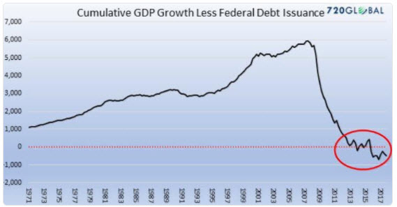 Houses, over the long term, should appreciate in line with inflation, no more no less. Anything above that green box means house prices have gotten ahead of themselves, and below means they’ve fallen too far. But the Fed decided, all on its own, that the prior peak was a good thing and needed to be replicated as soon as possible. The idea here was morally bankrupt as it was illogical. The Fed thought that people living in houses with rising prices would experience a “wealth effect” and therefore both borrow and spend more, which would somehow be a good thing. The illogical part is not hard to work out. If you are already living in a house, and you have to live in one anyway, are you truly wealthier if it goes up in price? Obviously the answer is no, and a tiny bit of thought reveals the opposite. The only way to tap that wealth, without borrowing against it, would be to sell your expensive house and downsize or move away to a cheaper location. Moving nearby to an equivalent house does nothing for you expect waste realtor and other transaction fees. A more expensive house defeats the strategy entirely. Otherwise, living in a more expensive house costs you more in terms of insurance and property taxes. That is, it makes you poorer, not wealthier. Only in stupid-banker land does a liability that drains more cash from your pocket count as an asset. As Robert Kiyosaki has stressed in every lecture he’s given over the past 25 years, the house you live in is not an asset. Roofs need replacing, electricity and oil are consumed, painting and mowing and plowing are all part of simply preventing this thing from rotting straight away into the ground. Mortgage interest, insurance and property taxes have to be paid or you will quickly lose ‘your’ house to some authority or another. You see any cash flying into your pockets during any of that? Me neither. Therefore your house is a liability. Assets are things that put cash in your pocket, liabilities take cash out. I don’t know about you, but my house is far from perfect except when it comes to taking cash out of my pocket. There it’s batting 1.000 Hence, Robert Kiyosaki is right; the house you live in is a liability, not an asset. How does someone become richer if they borrow more against their money pit? Well, that’s the entire centerpiece of the Fed’s decision to drive house prices up. It makes you richer. That’s their whole plan, laid bare. Now a cash flowing rental property, either residential or commercial, is another matter entirely. Those areassets. Lever up for those! Borrow away. We’ll be holding a Real Estate investing webinar in January so keep an eye out for that and be sure to sign up. The immoral part of the Fed’s decision to drive up house prices has two parts. The smaller part concerns the immorality of encouraging people to go deeper into debt (refi’s, HELOCS, etc.) by leveraging a liability. Bankers not should but do know better. The larger part centers on forcing an entire generation (e.g. Millennials) to either skip buying a house because they can’t afford one, or to buy a more expensive house than they can reasonably or comfortable afford. Put simply, the Fed threw an entire generation under the housing bus just so that the older folks could feel a little better about the price of their already purchased and lived-in home and maybe spend a little more. It’s no different than setting your house on fire because you are a tiny bit cold. This was crass, and vulgar, and utterly indefensible. It’s Over After ten long years of steadily rising equity markets, or ““markets”” as we like to call them to denote their fictitious and often fraudulent nature, something approximating volatility has returned here very late in 2018. As we head into 2019, we’re expecting to see a lot more volatility and even more losses as reality once again steps back into vogue. It never really left, of course, only was kept away for a while with monetary Botox administered by self-delusional bankers and politicians unable to face their many failures directly. Every recovery eventually ends and this one is no different. In our view, however, any recovery built on a foundation of cheap credit will not only end but end badly. This is easy to understand in neighborhood terms. Suppose you and your neighbor both earn $100,000. Next year you both still earn $100,000 but your neighbor borrows an additional $25,000 on their credit card to spend on things like a gardener, a boat, and a couple of trips. The way the government records things your neighbor had their personal economy expand by 25% and that's a very good thing. Neither the US government nor the Federal Reserve bother to back out the borrowing when they count up economic activity. Of course, they should, because all borrowing really represents is future consumption taken today. Your neighbor, when they have to pay back that $25,000, plus interest, will have to forego that amount of future consumption to pay back the debts. How dumb is it to not factor out borrowing when considering economic activity? Fantastically dumb. Here’s what happens to US GDP growth when just the increase in the federal debt is taken out: