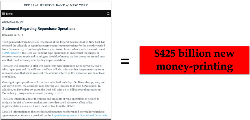 Evidence for dollar weakness just ahead and lasting for at least the first half of 2020 is growing. Last week saw the Federal Reserve hold steady its benchmark interest rate, which remains at a range of 1.50% - 1.75%. However, the bigger news was the announcement of $425 billion in new money-creation via the repurchase (“repo”) market, an operation which is designed keep overnight borrowing in the banking system flowing.