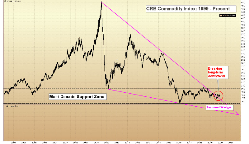 Yet over the short-term, the break of the 12-year terminal wedge does suggest that a notable surge across the average of commodities is likely for the first six months of 2020. It is this surge which will be a primary driver for gold and silver’s next advances.