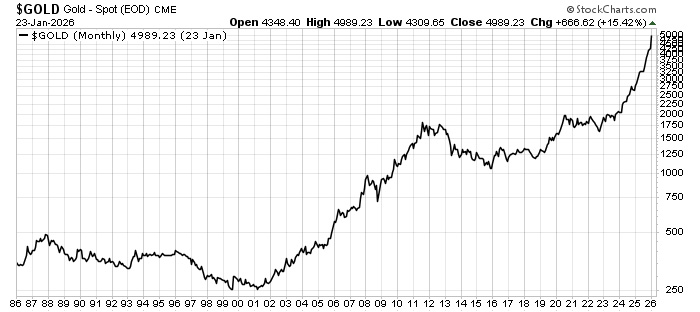 The dirty secret about currencies is that they aren’t backed by any assets. The U.S. dollar is backed by the “Full Faith and Credit” of the U.S. government. There is an old saying that gold is money and everything else is just credit. In other words, gold is an actual payment. Paper is a promise to pay you later. That’s an important distinction. The value of paper money relies on all of us agreeing that it is worth something. That’s true for all currencies today…dollars, yen, euros, etc. It’s all just a wink and a nod that it’s worth something real. The risk is that we stop believing. And that’s what’s happened today…not in the dollar, but in the system. And the rising gold price is a symptom of that. It’s the canary in the coal mine of a potential currency drama. And the problem is Japan. A quick note here, bond yield moves opposite bond prices. Rising yields mean the prices of the bonds are going down. In other words, people are selling long-term Japanese bonds. The 10-year bond yield broke 2.3%. That’s its highest level in 100 years. The ultra long bond yields are also ripping higher. The Japanese 20-year yields reached 3.4%, the 30-year yield broke 3.6%, and 40-year yield hit 4%. The last time we saw this was in 2007, right before the global financial crisis. Investors bailed out of these bonds due to worries about government spending and inflation. More importantly, investors fear that this problem is contagious. That the fears around the yen could spread to other currencies like a virus. And that is driving the price of gold higher. You can see that the gold price moved in lockstep with the Japanese 10-year bond yield. The yield was near zero just four years ago. It doubled since May 2025. That’s an incredible (and troubling) run. As investors sell and drive up the yield, the price of gold goes up: