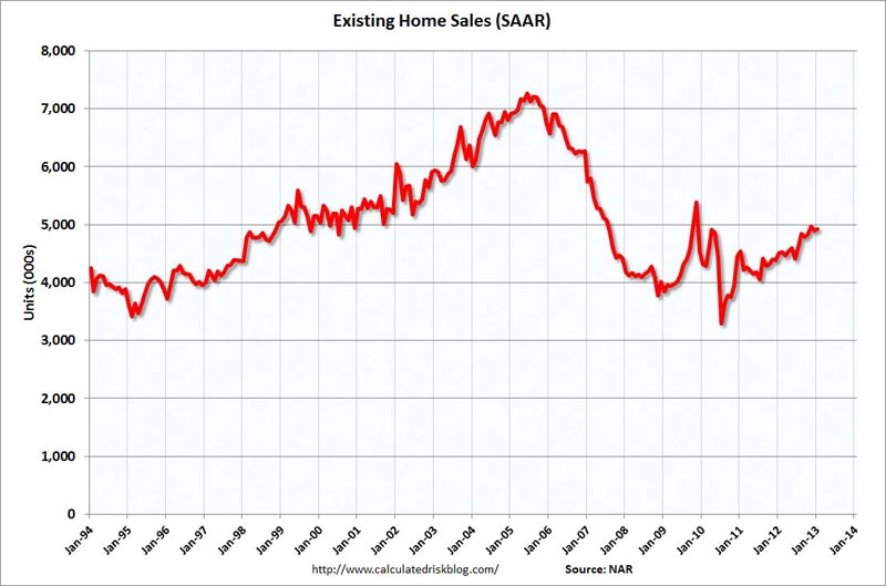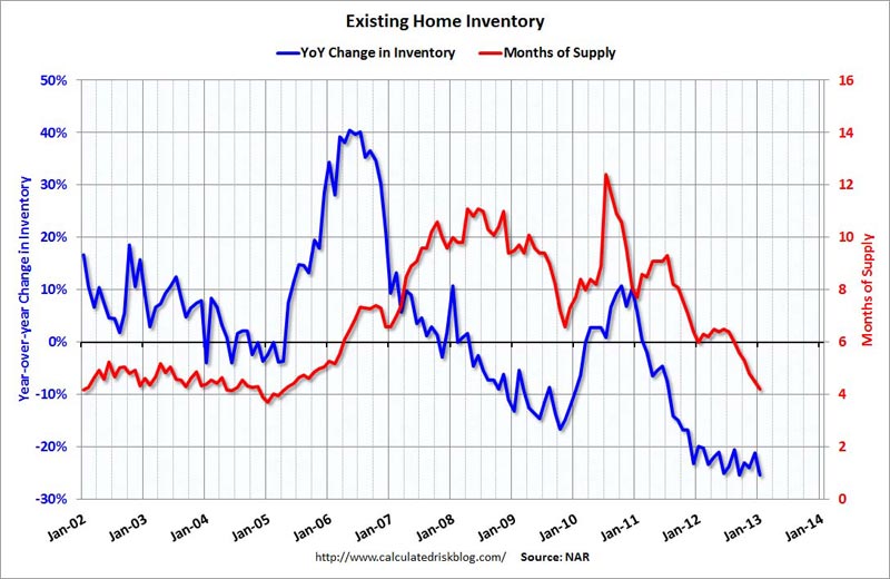 “Buyer traffic is continuing to pick up, while seller traffic is holding steady. In fact, buyer traffic is 40 percent above a year ago, so there is plenty of demand but insufficient inventory to improve sales more strongly. We’ve transitioned into a seller’s market in much of the country. We expect a seasonal rise of inventory this spring, but it may be insufficient to avoid more frequent incidences of multiple bidding and faster-than-normal price growth." - Lawrence Yun - NAR mouthpiece/economist - February 21, 2013